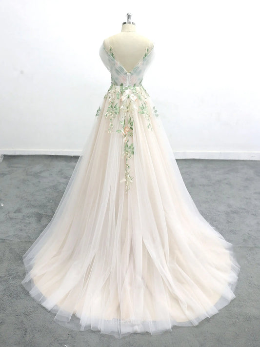 Vestido de novia con apliques de encaje color champán y cola catedral W0093