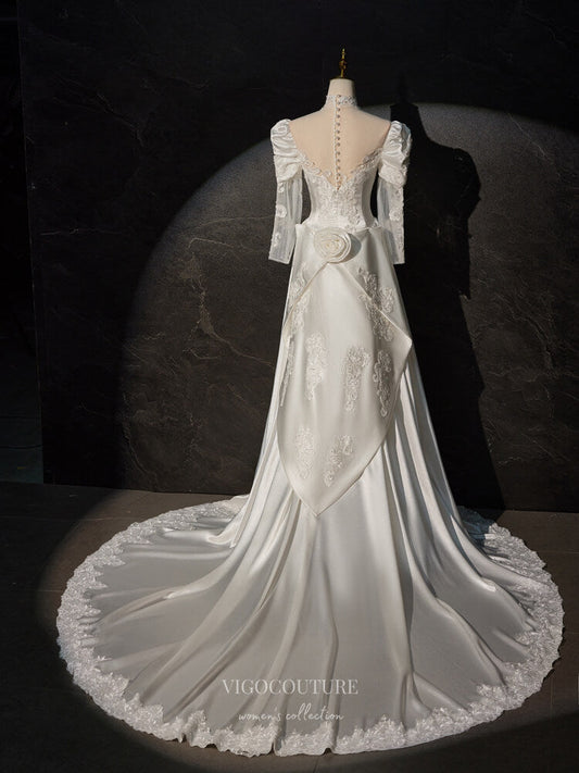 Vestido de novia de manga larga y cuello alto con apliques de encaje color marfil 24250