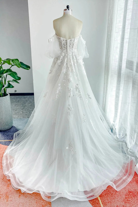 Ivory Lace Wedding Dress with Removable Puff Sleeves, Sweetheart Neckline, High Slit & Sweep Train – W2254