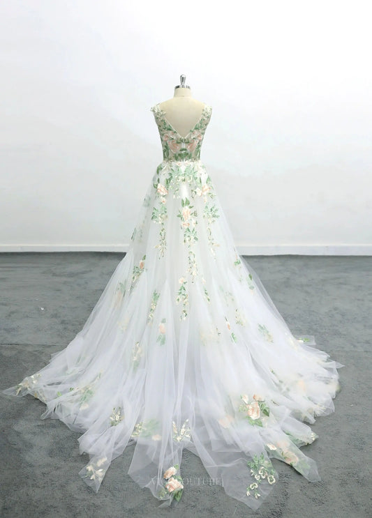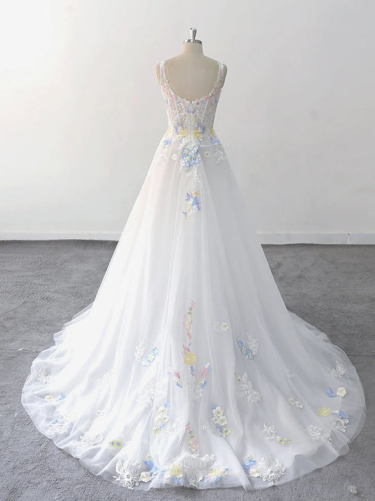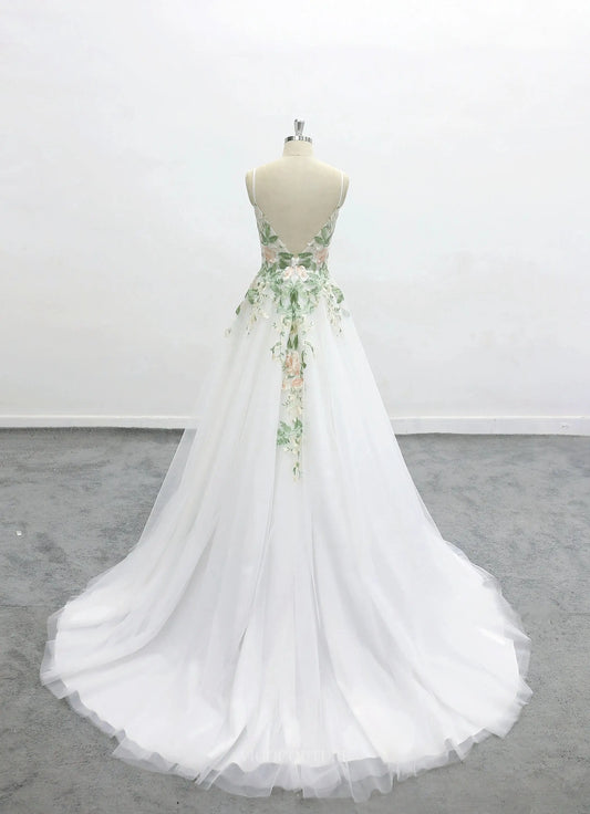 Vestidos de novia de tul con encaje color marfil, escote en V, tirantes finos y cola capilla - MQ017