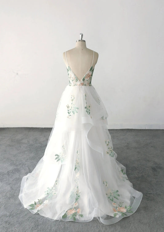 Vestido de novia de tul con encaje color marfil, tirantes finos, escote en V y falda escalonada - MQ013