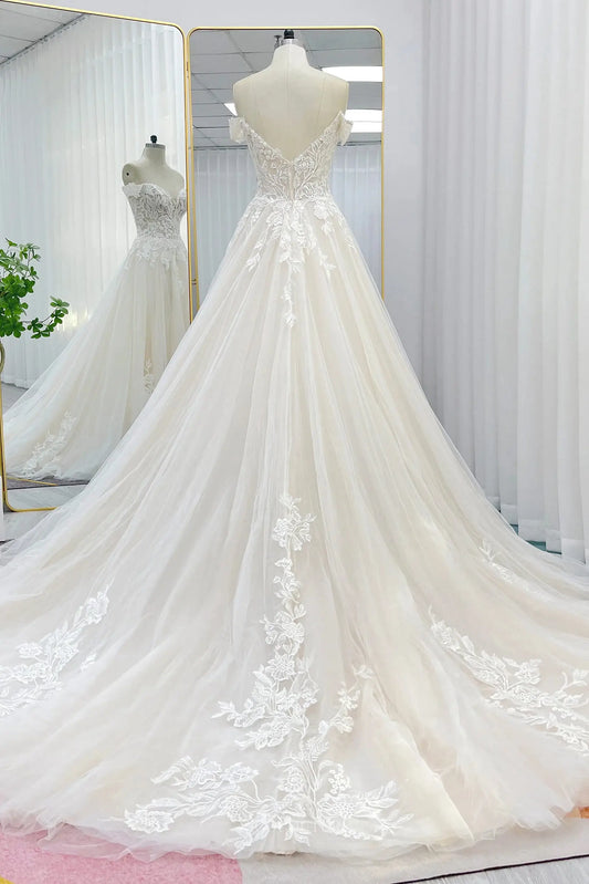 Vestidos de novia de tul con encaje color marfil, tirantes finos, escote corazón y cola capilla - MQ020
