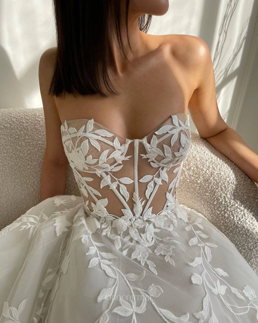 Vestido de novia con apliques de encaje, sin tirantes y transparente, con cola de capilla W0127
