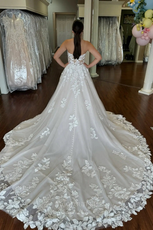 Strapless Lace Appliqué Ball Gown Wedding Dress with Plunging V Neck and Cathedral Train – W2241
