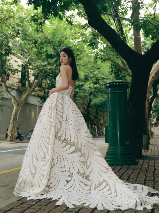 Vestido de novia sin tirantes con apliques de encaje y abertura en forma de corazón, cola capilla W0121