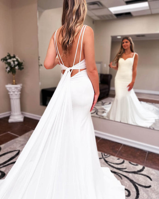 Vestido de novia de corte sirena con escote corazón y cola de gasa con tirantes finos W0164