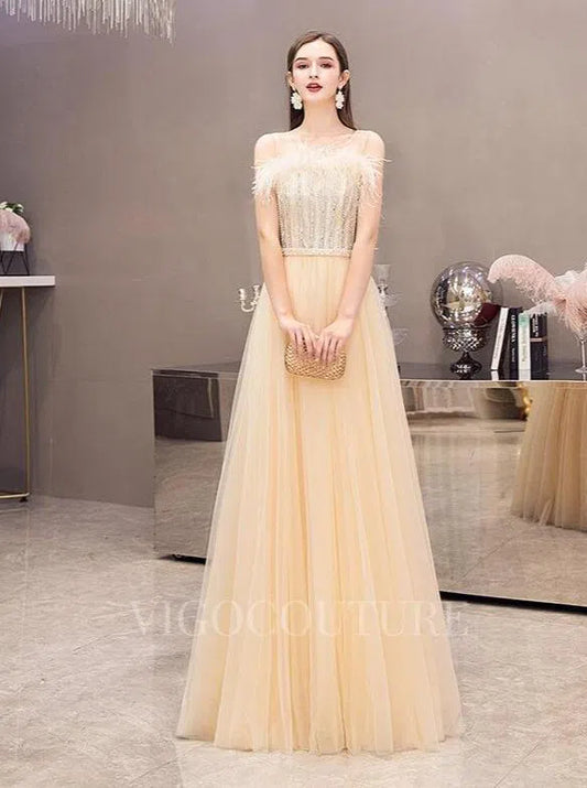 Vestido de noche con plumas y cuello barco, vestidos de fiesta con cuentas 20110
