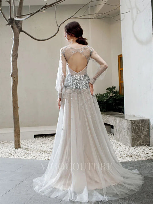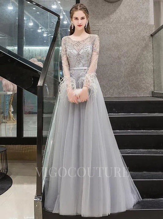 Vestidos de fiesta con cuentas y mangas extra largas, cuello redondo y cuentas 20257