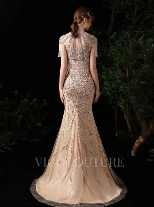 Vestidos de noche de sirena color champán con cuello alto y cuentas 20069