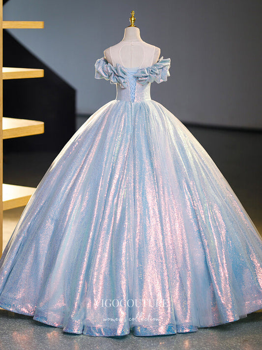 Vestidos de fiesta de lentejuelas azules con hombros descubiertos y brillantes para quinceañera BG027
