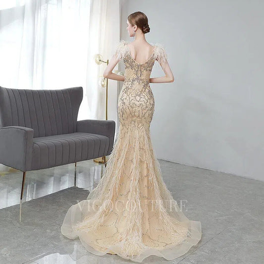 Vestido de fiesta de sirena con plumas y cuentas, escote en V, 24523