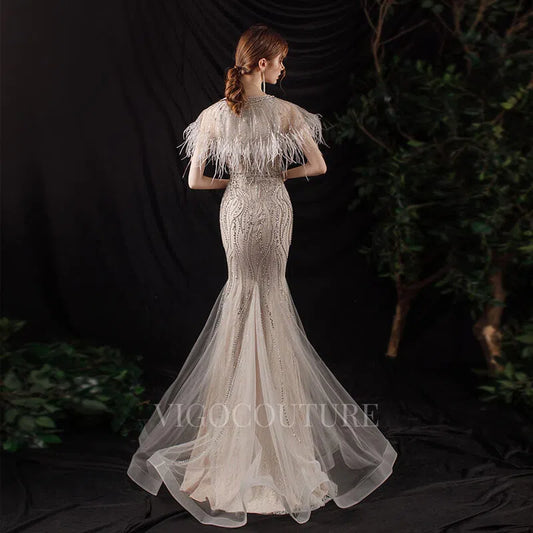 Vestido de fiesta de manga larga con plumas y cuentas de sirena, cuello alto, 24520