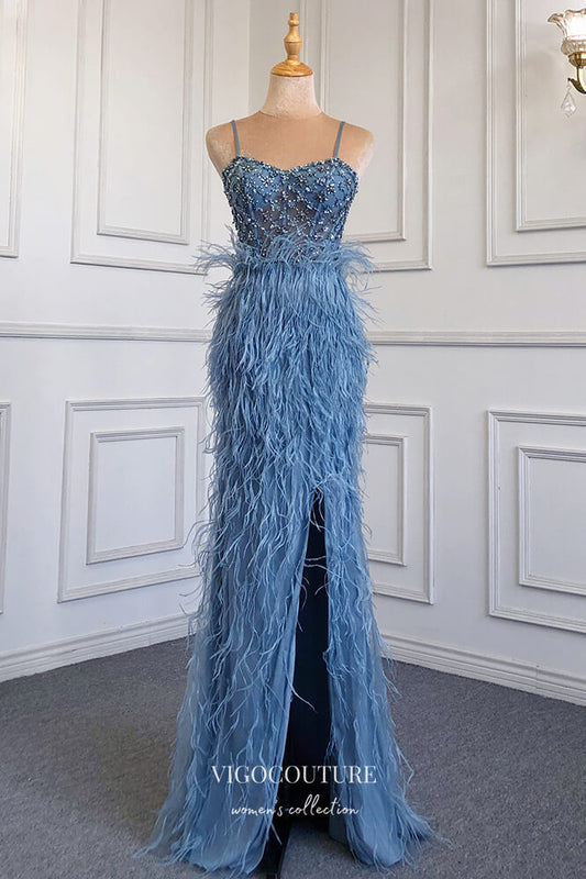 Vestido de fiesta de sirena con cuentas y tirantes finos y plumas 21626