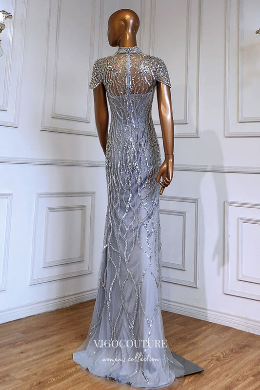 Vestido de fiesta de sirena con cuentas y cuello alto y mangas cortas 21627