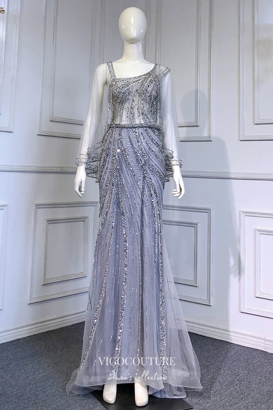 Vestido de fiesta de sirena con cuentas y manga larga 21628
