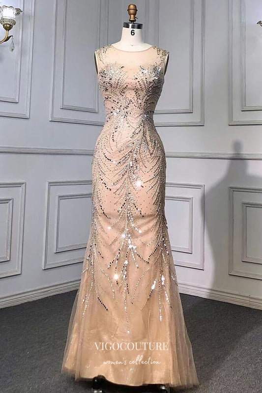 Vestido de fiesta de sirena con cuentas, manga larga y cuello alto, 21619