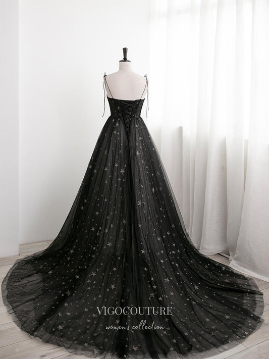 Vestidos de fiesta de tul negro con estrellas y tirantes finos 21320
