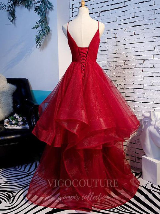 Vestido de fiesta de tul rojo con volantes y tirantes finos 20548