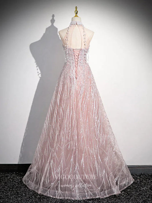 Vestidos de fiesta con encaje y perlas rosas 2025, vestido de noche con cuello halter 25071