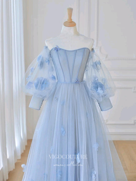 Vestidos de fiesta florales azul claro, vestidos formales de manga larga 21156