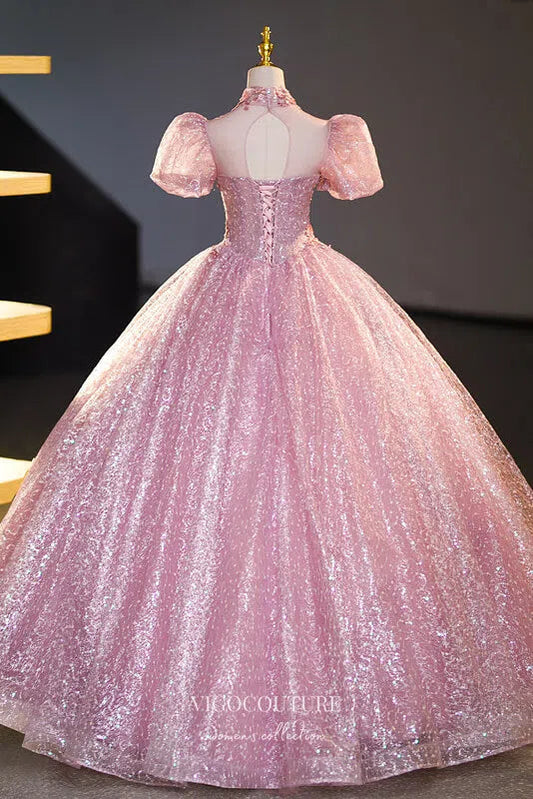 Vestido de fiesta de quinceañera con apliques de encaje rosa y mangas abullonadas 22352