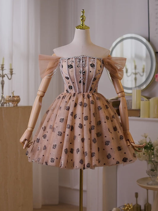 Vestido de regreso a casa con escote en V y lentejuelas en color champán, con encaje, hc406