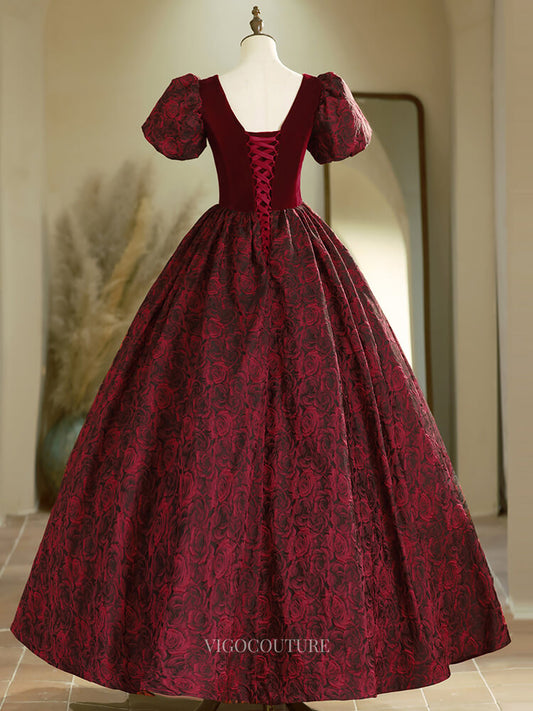 Vestidos de fiesta de jacquard burdeos con mangas abullonadas y escote de terciopelo, vestidos de quinceañera BG020