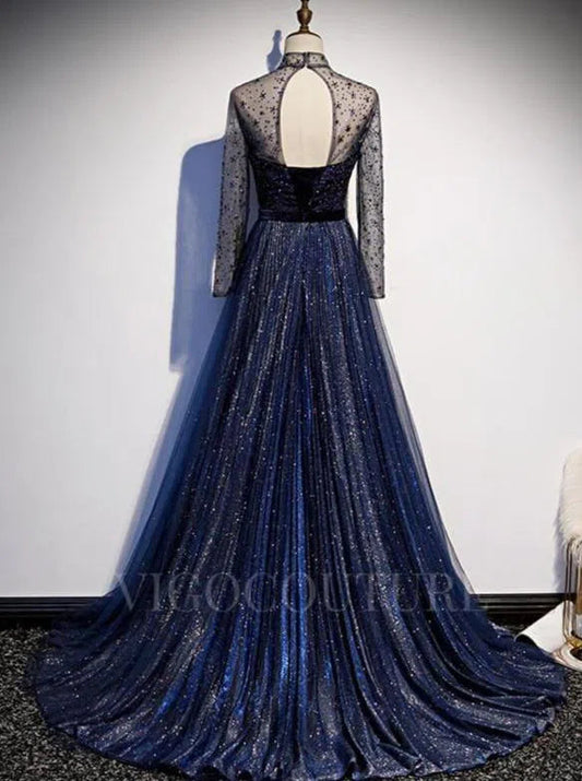 Vestido de fiesta de tul brillante de manga larga y cuello alto 2022