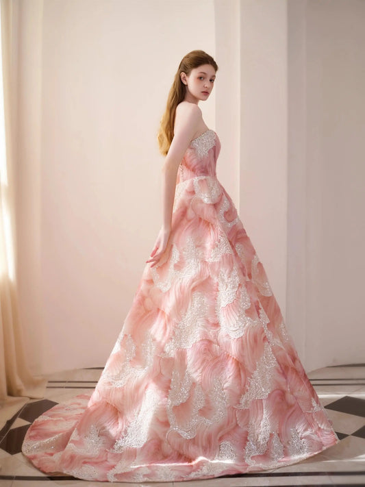 Vestido formal rosa sin tirantes, con volantes escalonados, corpiño de cuentas y parte inferior con flores 3D – Estilo 25301