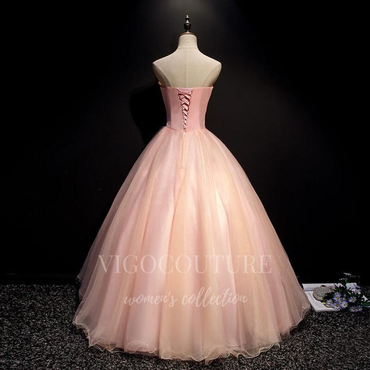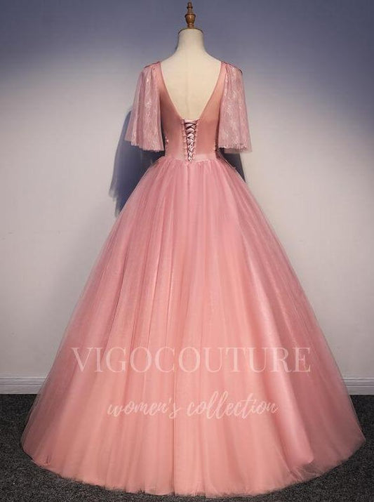 Vestido de quinceañera rosa con mangas al codo y apliques de encaje 20456