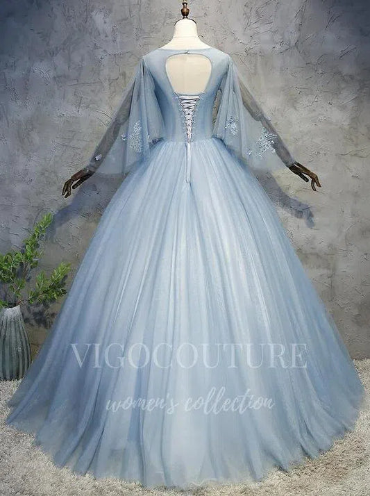 Vestido de quinceañera de manga larga azul claro con apliques de encaje 20450