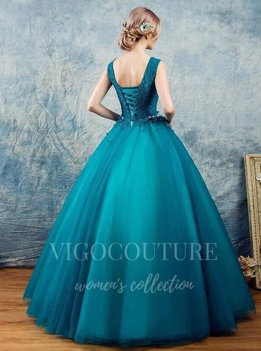 Vestido de quinceañera azul verdoso con escote en V y apliques de encaje 20454