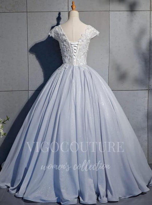 Vestido de quinceañera plateado con escote en V y apliques de encaje 20451