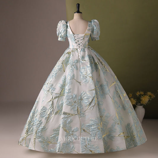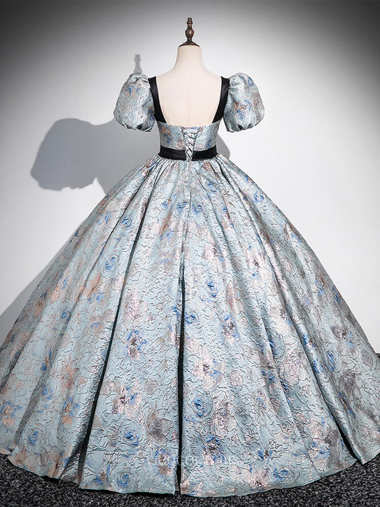 Vestidos de fiesta de jacquard azul con mangas abullonadas y espalda de corsé, vestidos de quinceañera BG054