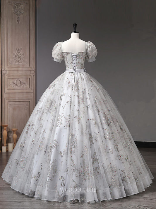 Vestidos de fiesta de encaje gris brillante con mangas abullonadas y cinturón, vestidos de quinceañera BG057
