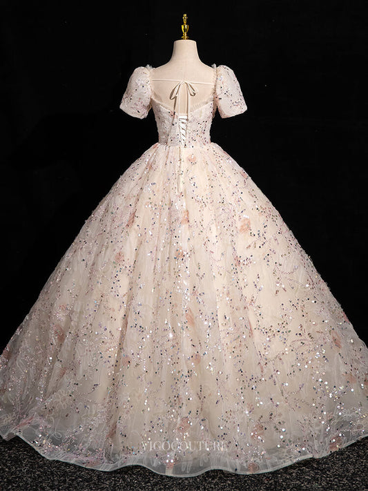 Vestidos de fiesta de tul con flores color champán, mangas abullonadas y escote corazón, vestidos de quinceañera BG052