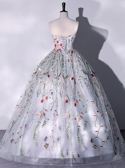 Vestidos de fiesta con encaje floral plateado, sin tirantes, para quinceañeras, BG063