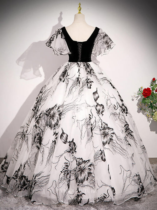 Vestidos de fiesta florales en blanco y negro con mangas abullonadas, cinturón y corpiño de terciopelo, vestidos de quinceañera BG050