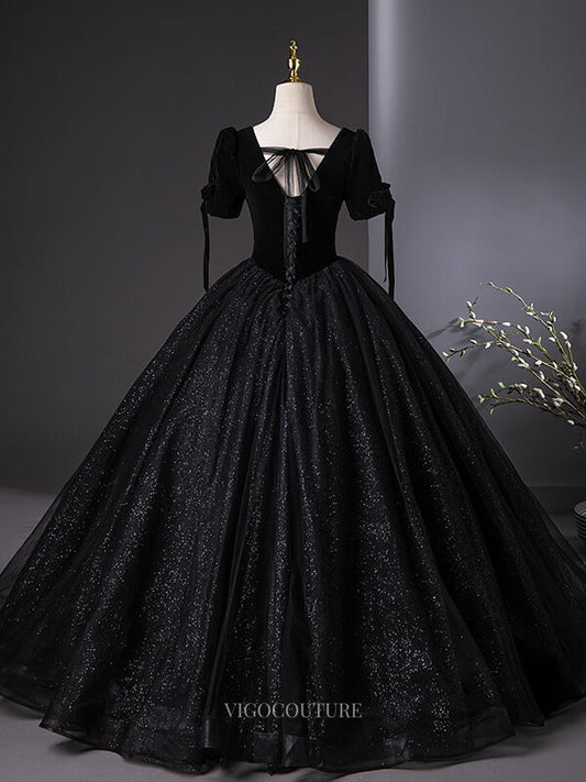 Vestidos de fiesta de tul negro brillante con mangas abullonadas y corpiño de terciopelo, vestidos de quinceañera BG043