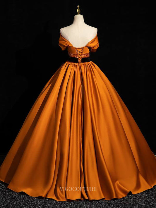 Vestidos de fiesta de satén naranja quemado con cinturón, corpiño de cuentas y hombros descubiertos para quinceañera BG044