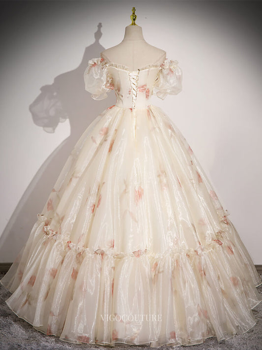 Vestidos de fiesta de organza con flores color champán, mangas abullonadas y hombros descubiertos, vestidos de quinceañera BG048