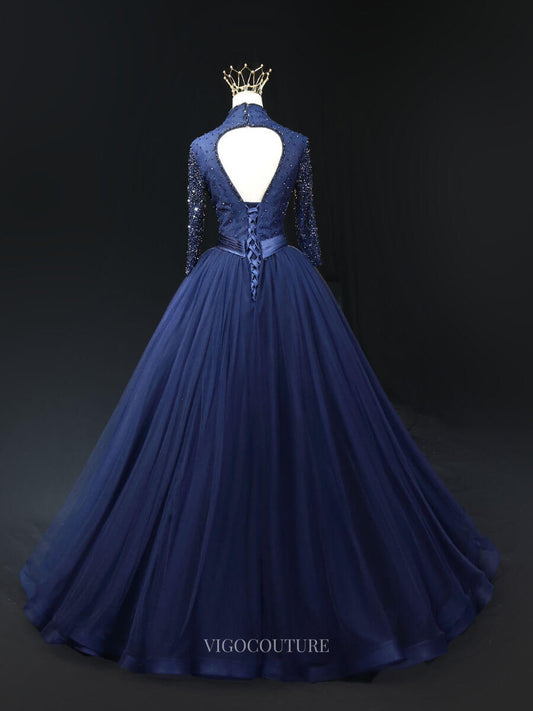 Vestidos de fiesta de tul azul oscuro con manga larga, escote en V y corpiño de cuentas, vestidos de quinceañera BG046