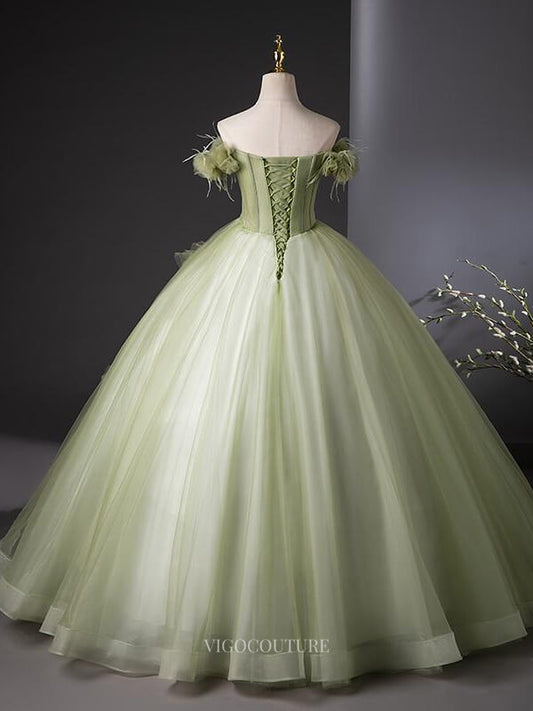 Vestidos de fiesta de tul verde con flores 3D, espalda de corsé y tirantes finos para quinceañera BG041