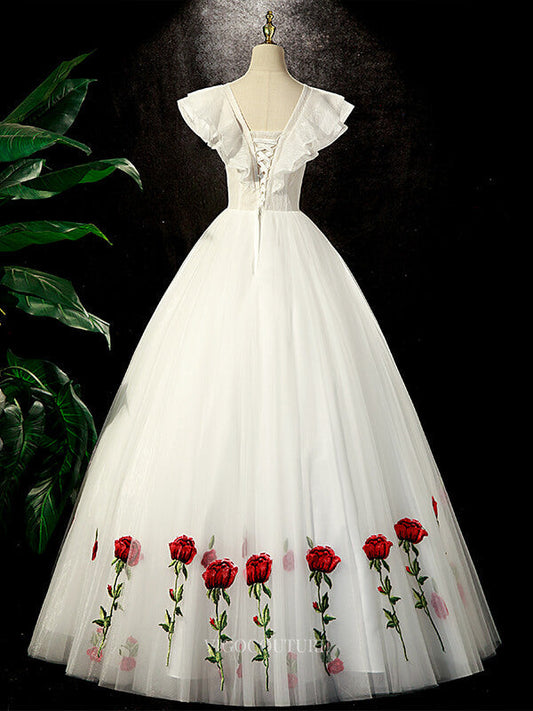 Vestidos de fiesta de tul blanco con flores y escote en V BG049