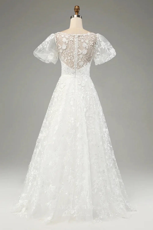 Ivory Floral Lace Wedding Dress with Puff Sleeves, Illusion Neckline, and A-Line Skirt – W2239