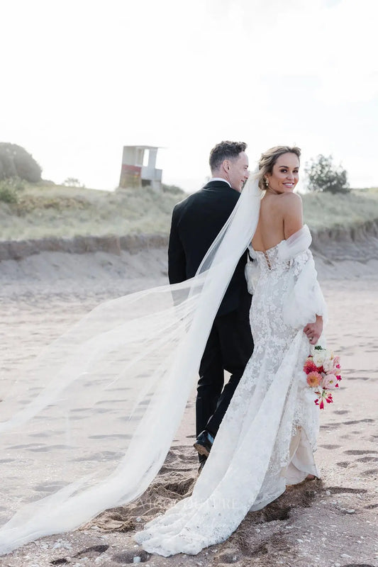 Ivory Lace Mermaid Wedding Dress with Off-Shoulder Sweetheart Neckline, Sheer Corset Back, Detachable Puff Sleeves & Cathedral Train – W2268
