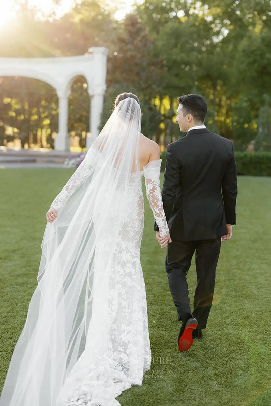 Ivory Off-Shoulder Lace Wedding Dress with Long Sleeves, Button Back & Chapel Train – W2261