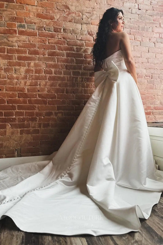 Elegant Satin Strapless Wedding Dress with Pearl Embellished Neckline, Bow Back, Pockets and Button Train – W2362