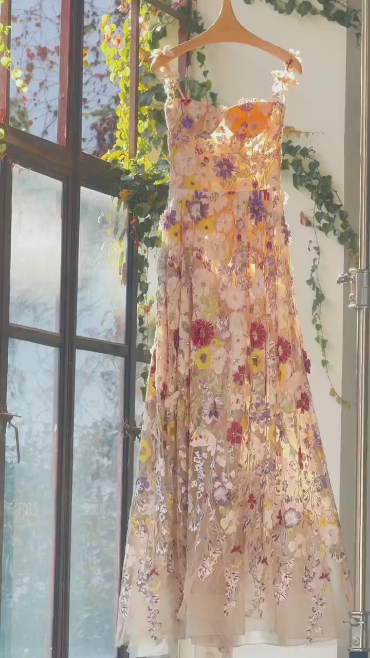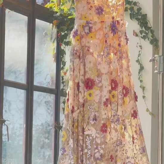This romantic floral formal dress is the perfect choice for garden weddings, engagement shoots, or elegant outdoor occasions. The delicate sheer illusion bodice is adorned with vibrant 3D floral appliqué in soft tones of purple, red, and yellow, flowing into a lightweight A-line tulle skirt. Finished with charming floral shoulder straps, this gown captures the essence of nature with a refined, ethereal touch.