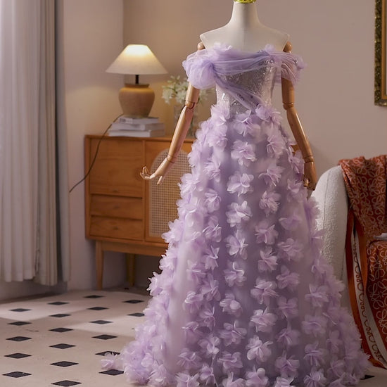Lavender Off-Shoulder Ball Gown with Sequin Corset Bodice & 3D Floral Tulle Skirt – 25500